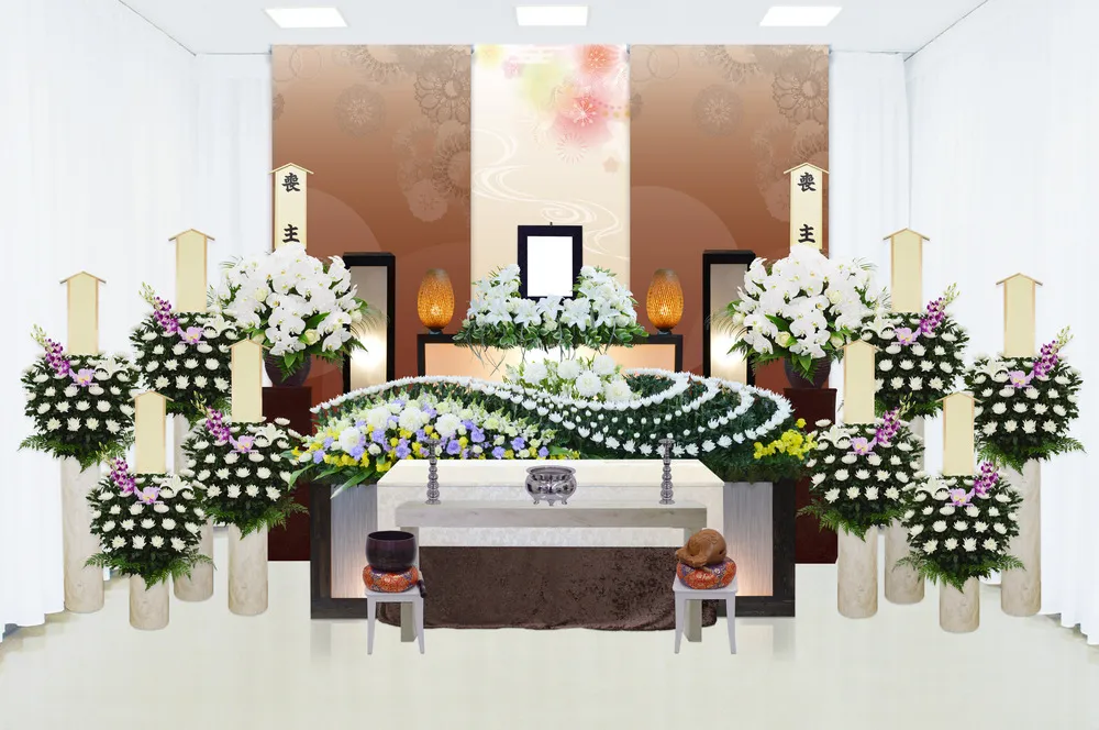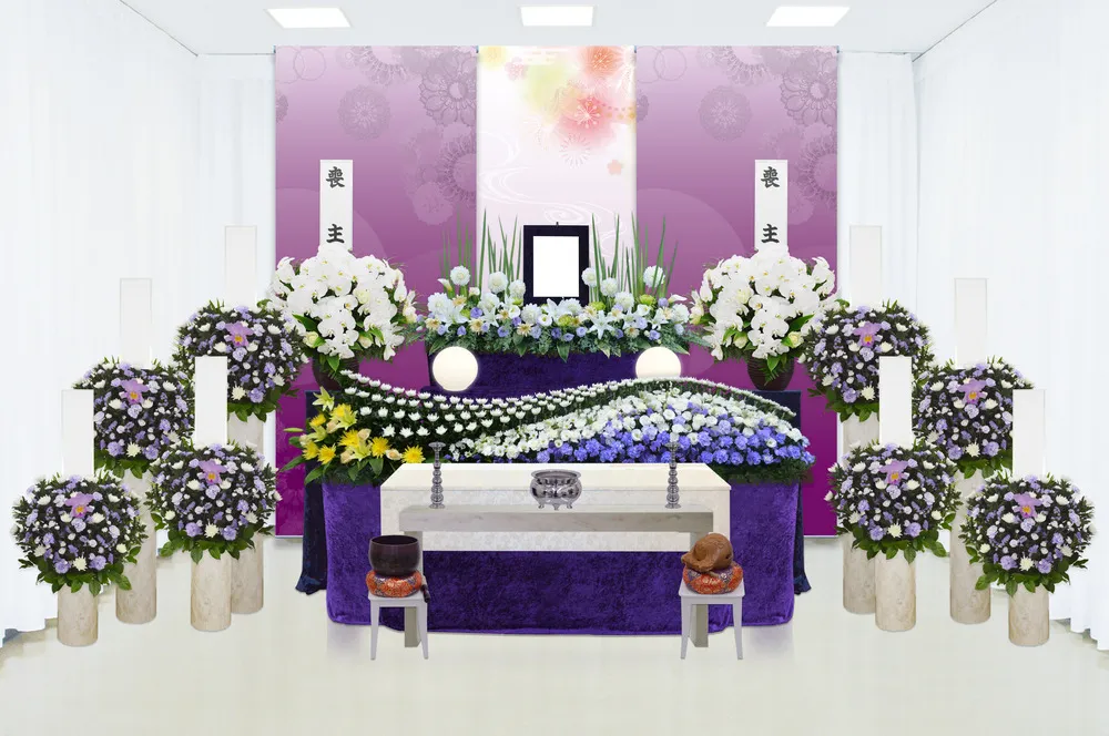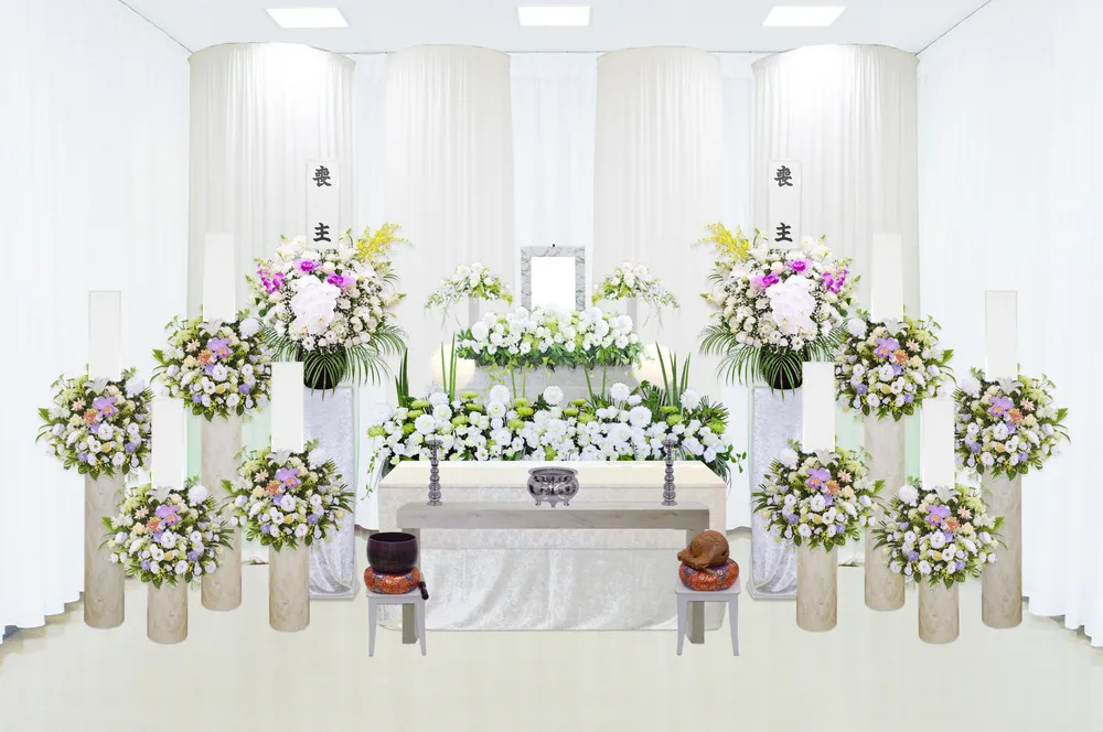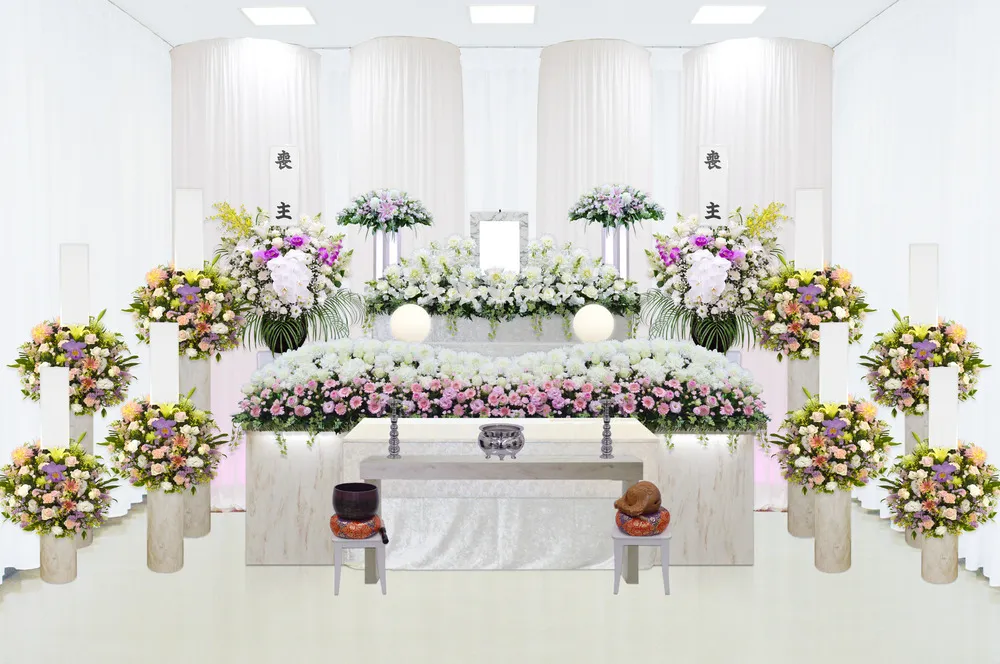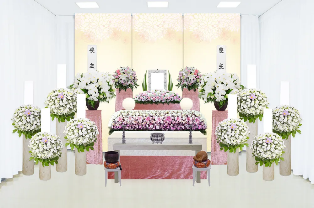 国産の上質な生花を贅沢に使用し、故人さまの人柄を反映させた祭壇を制作いたします。祭壇背景にはドレ-プやロールスクリ-ン、間接照明を設置しワンランク上の葬送空間を演出します。