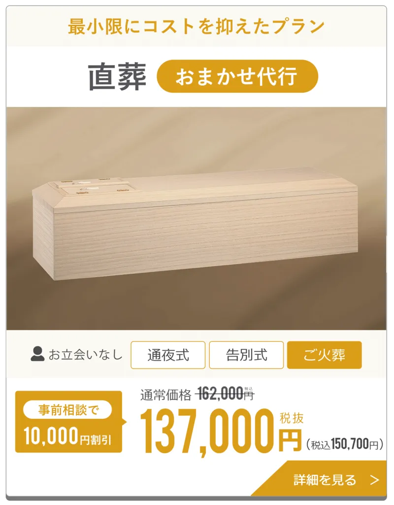 宗教儀式などはせず簡素に行いたい、最小限に費用を抑えたいという方向けのプランです。ご逝去後の搬送からご火葬までを一貫してご遺族さまの代わりに、弊社職員が責任をもって施工いたします。