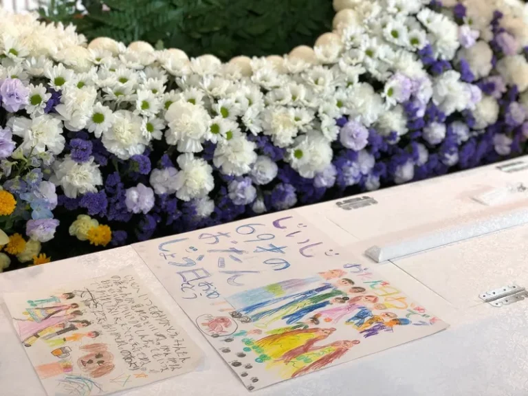 祭壇に飾った沢山の生花はご出棺時に、ご家族さまと参列者の方々の手で御柩の中にお入れします。お花に囲まれて華やかに故人さまをお見送りすることができます。