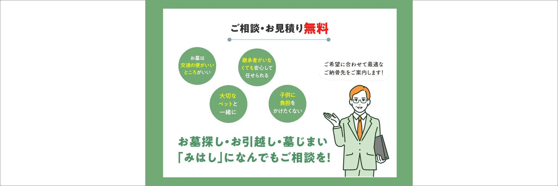 メモリアルプランナーみはしでは一般墓から樹木葬、納骨堂、永代供養墓などお客様の地域の優良墓地をご案内しております。またお墓の引越し(改葬)や、墓じまいなどのサポートも致しておりますのでお気軽にご相談ください。